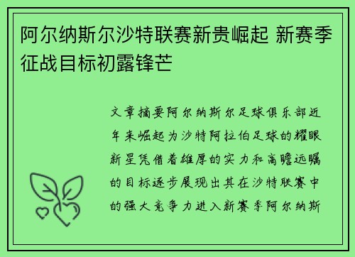 阿尔纳斯尔沙特联赛新贵崛起 新赛季征战目标初露锋芒