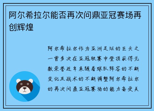 阿尔希拉尔能否再次问鼎亚冠赛场再创辉煌